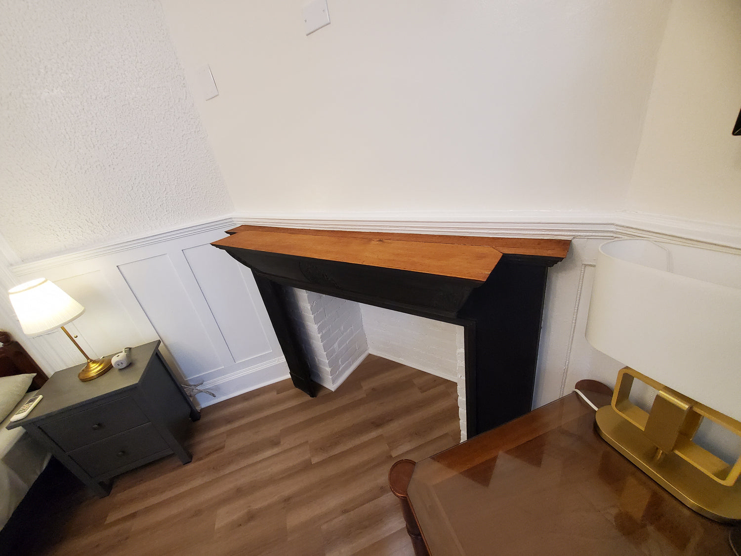 Closeup of oak mantlepiece, refinished with a distressed oil-char